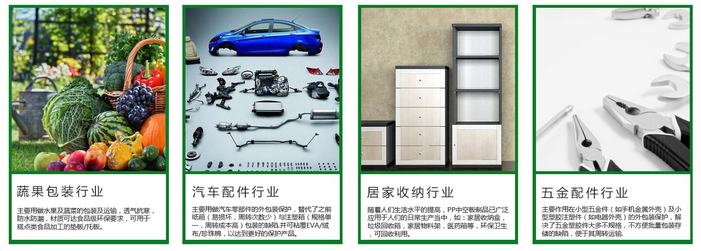 用途:通用包装、箱式车等物流包装、水果箱、周转箱、防潮板、广告板